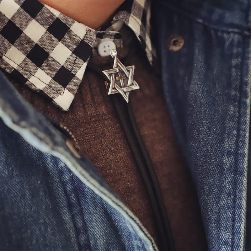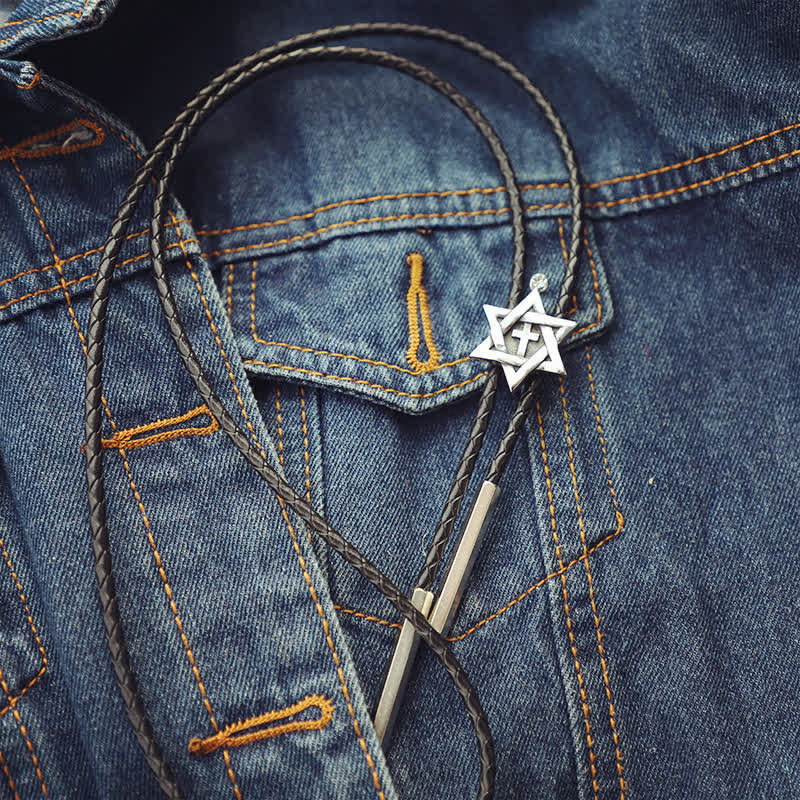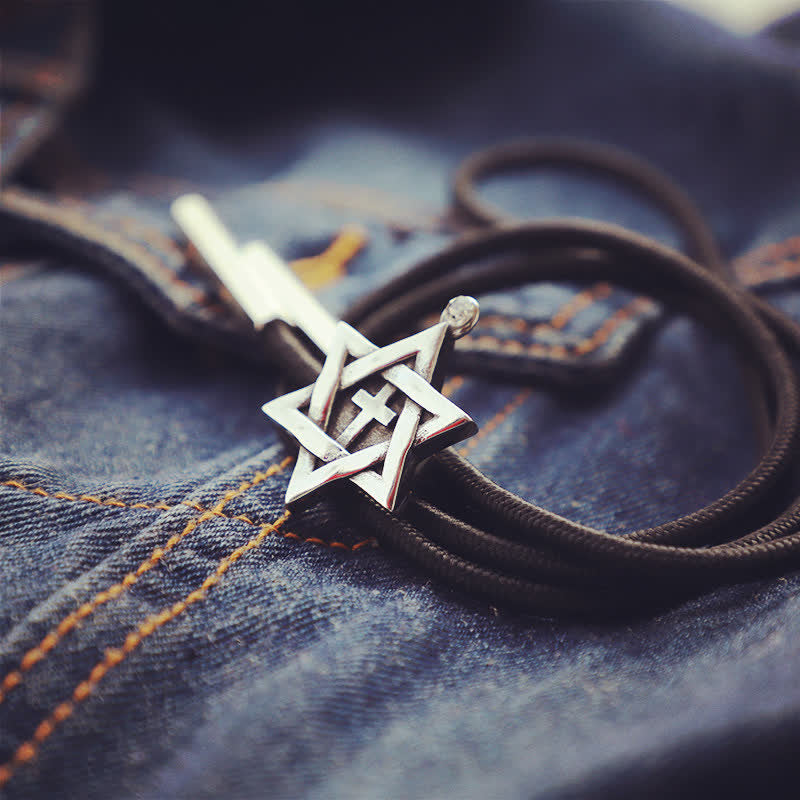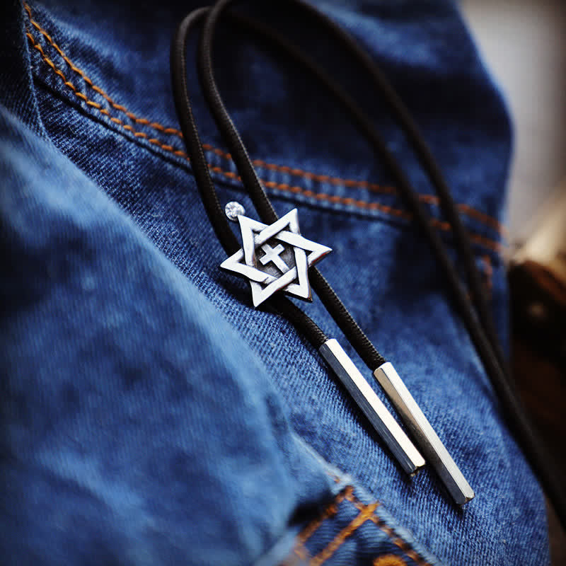 The upward point triangle symbolizes man's good deeds, which is directly towards to heaven. In turn, it activates a flow of goodness that comes back down to earth, and is depicted by the downward pointing triangle. This bolo tie with large Star of David pendant for success, good luck.