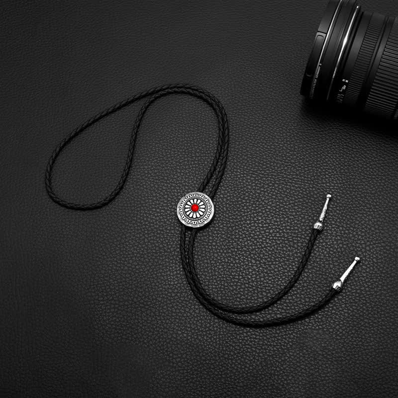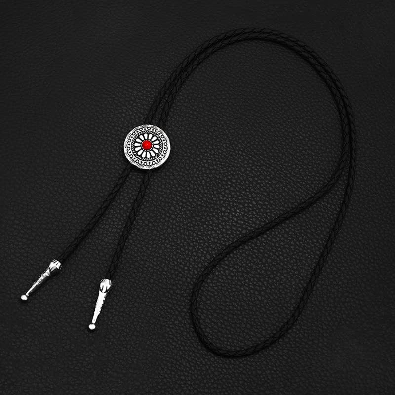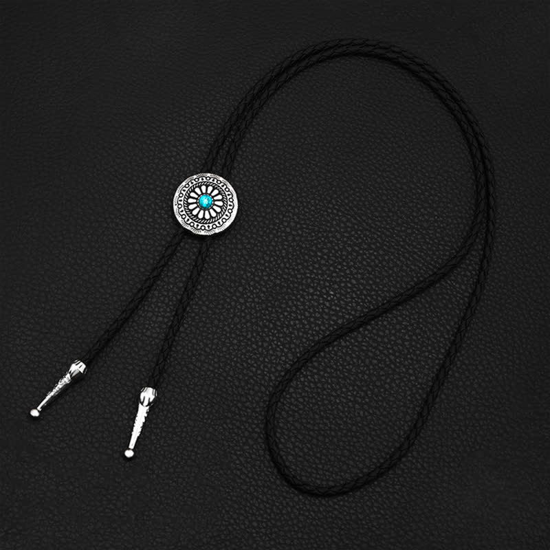 This awesome bolo tie has a southwestern design and stone centerpiece. It is the perfect statement piece for any outfit, adding touches of vintage charm to your look.