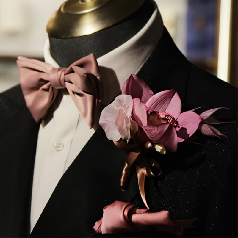 3Pcs Men's Smoky Pink Brooch Handkerchief Fishtail Bow Tie Set