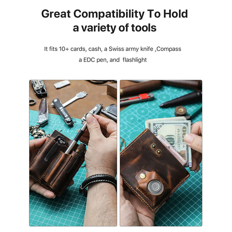 The leather was treated with a rugged and distressed effect, and it gets better with age. All in one EDC sheath, owning an tool leather sheath can hold all your EDC gears, multitools, pens, flashlights, knives, keep them organized, hold them in place, and not lose any parts. It's suitable for outdoor activities.