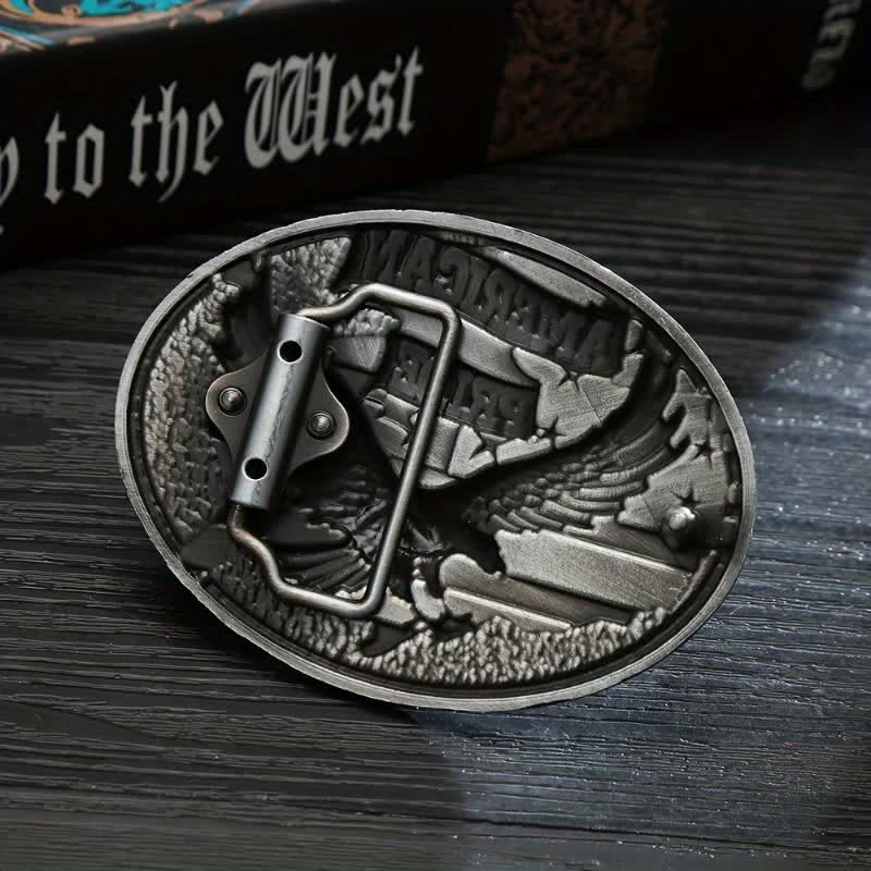 The buckle features a 3D eagle overlooking the American flag. Clearly visible across the front of the buckle, you'll find a gold plated American bald eagle with its wings fully extended.
