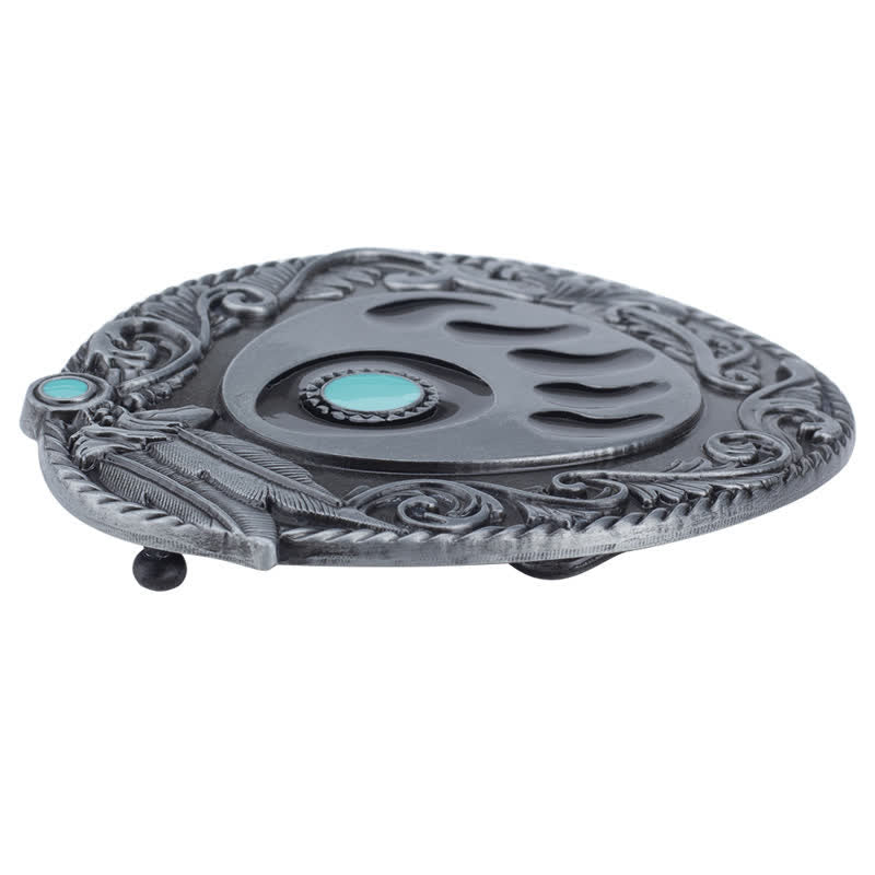 This is a retro silver American native western cowboy style belt buckle. The silver-tone buckle features a bear paw design at center, fancy flower & vine design decorates edge. Suitable for a lot of daily wear.