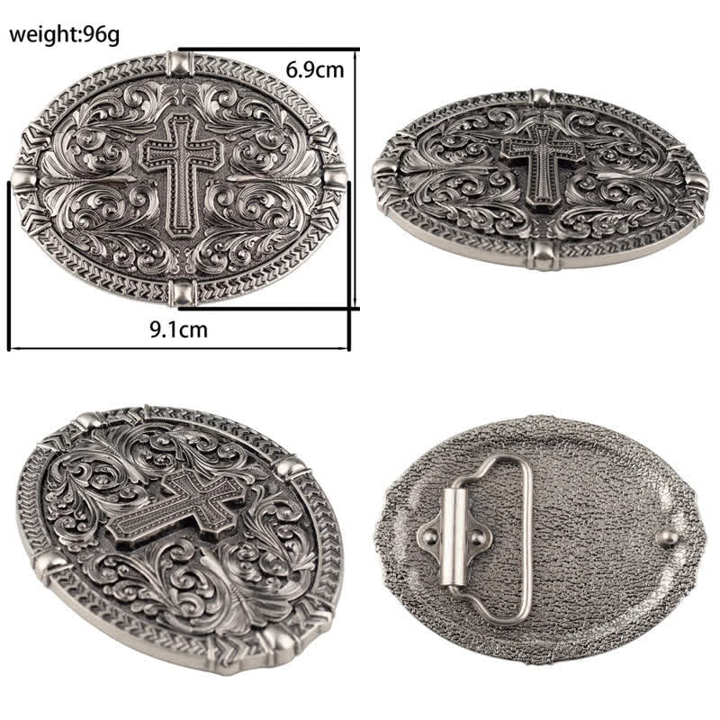 A traditional styled attitude buckle with a simple, religious design. It has a larger center cross with an inner wheat shaft design edged in a border of tiny microbeads.