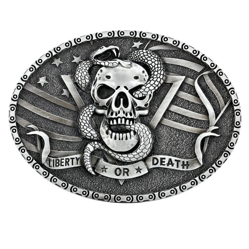 "Liberty or Death" Belt Buckle features a coiling snake inside of a skull in front of a waving USA flag & wreathed in a bike chain. This retro belt buckle is powerful and mysterious instead of scary.