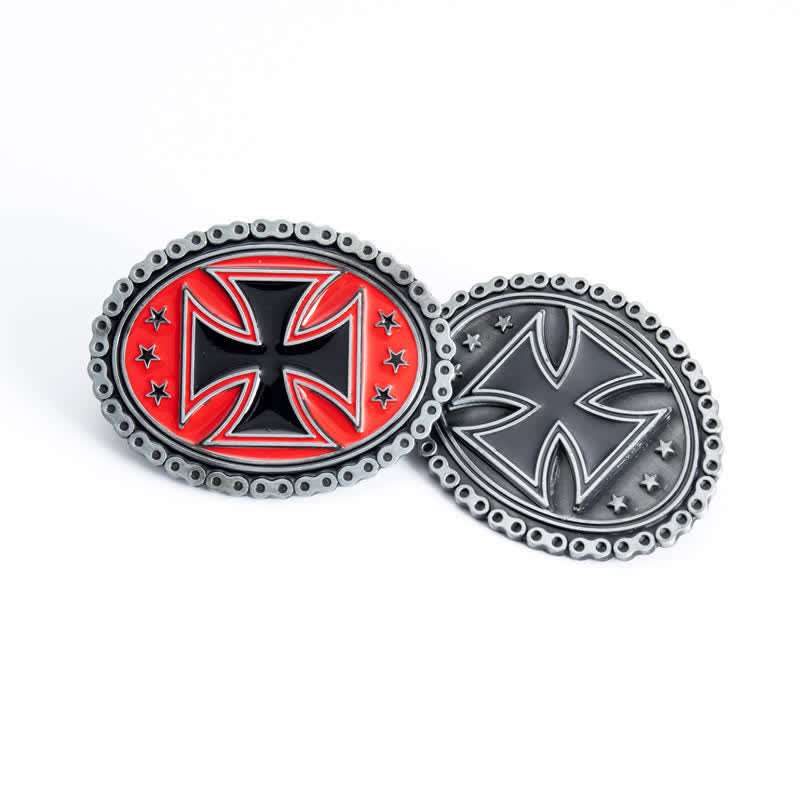 This Cross Belt Buckle features a big black cross in the middle and six stars were scattered on either side. This charming buckle was wreathed by a bike chain.