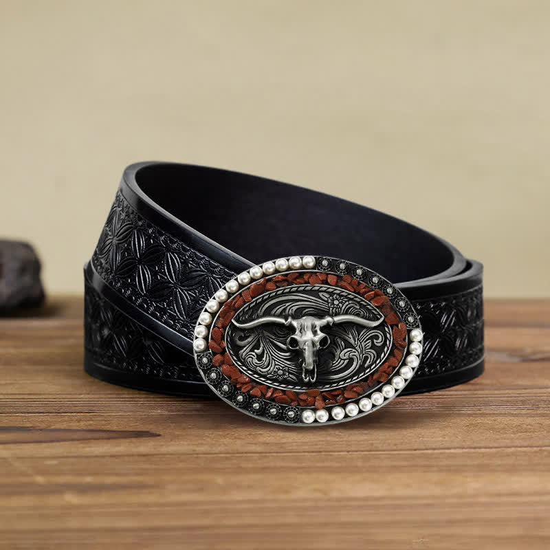 Men's DIY Sparkling Pearl Stones Bull Buckle Leather Belt