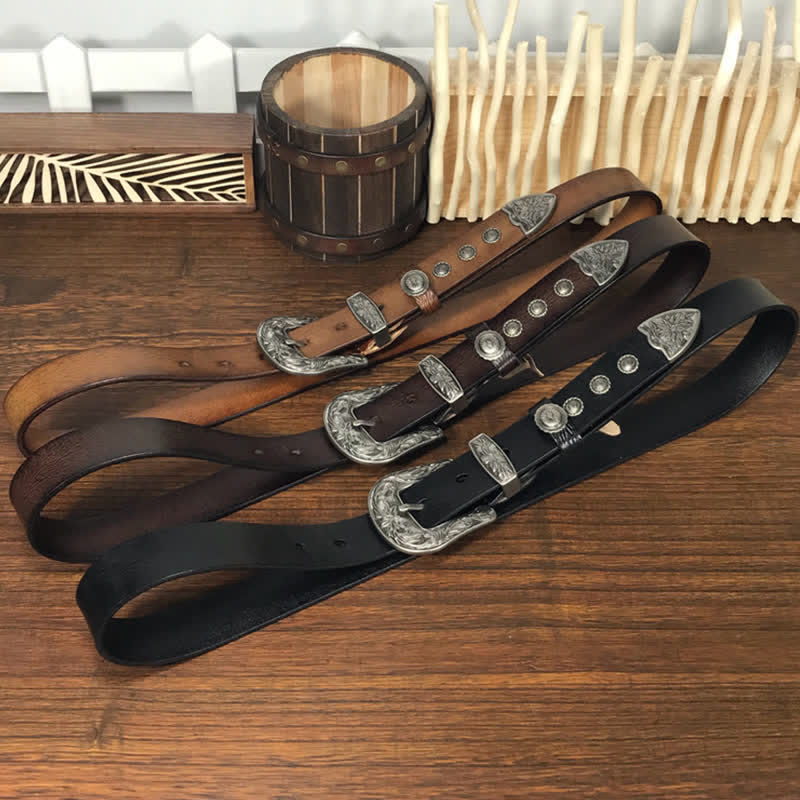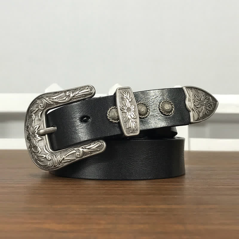 Vintage Carved Flower Buckle Rivet Studded Leather Belt