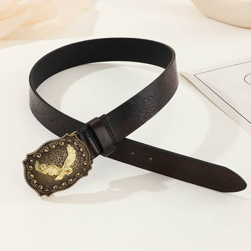 A splendid golden eagle may soar into view, it's an emblem of strength and courage. This belt is made of high quality PU leather and alloy buckle, decorated with embossed flower patterns, classic and beautiful.