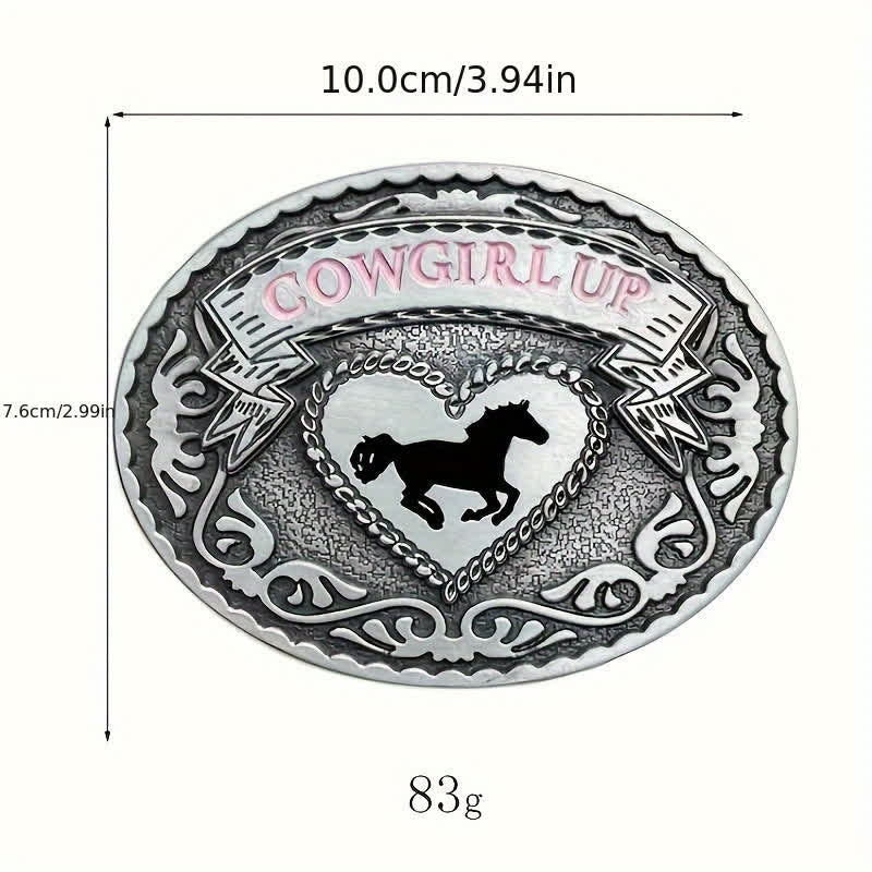 Dark silver with floral scrip, a detailed hear with the silhouette of a horse, and a banner reads in pink COWGIRL UP. Show your western heart and your toughness with this buckle.