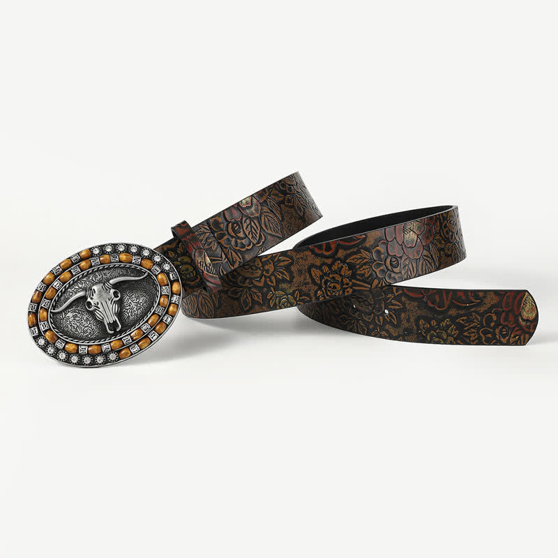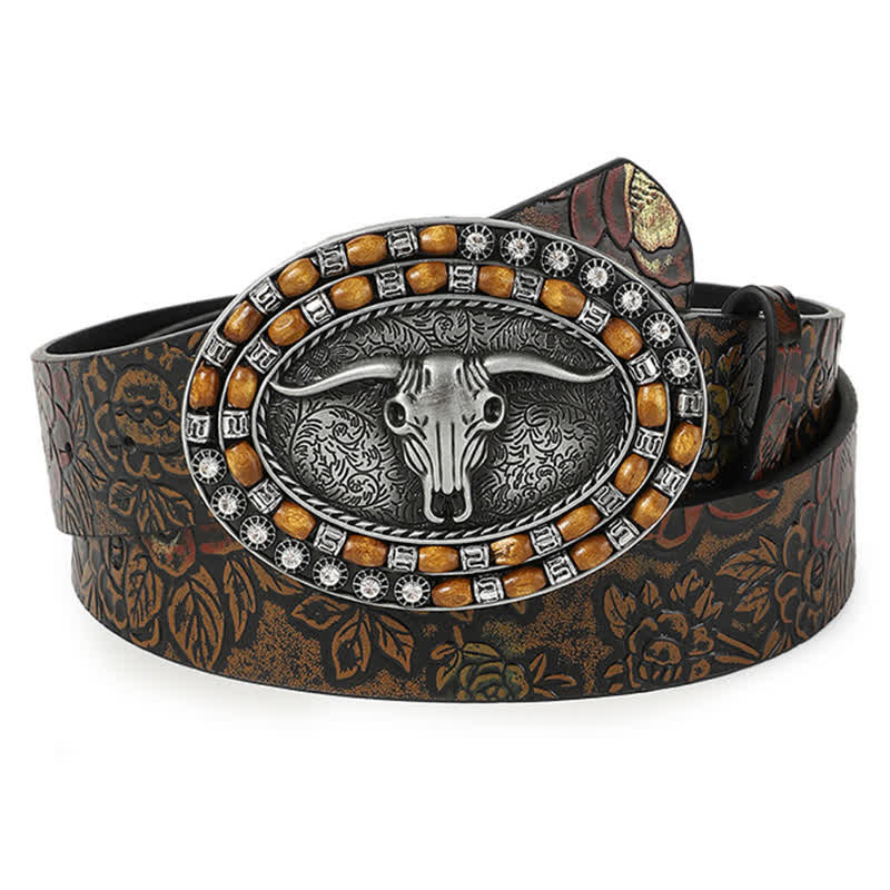 Men's Wooden Beads Carving Bull Head Leather Belt