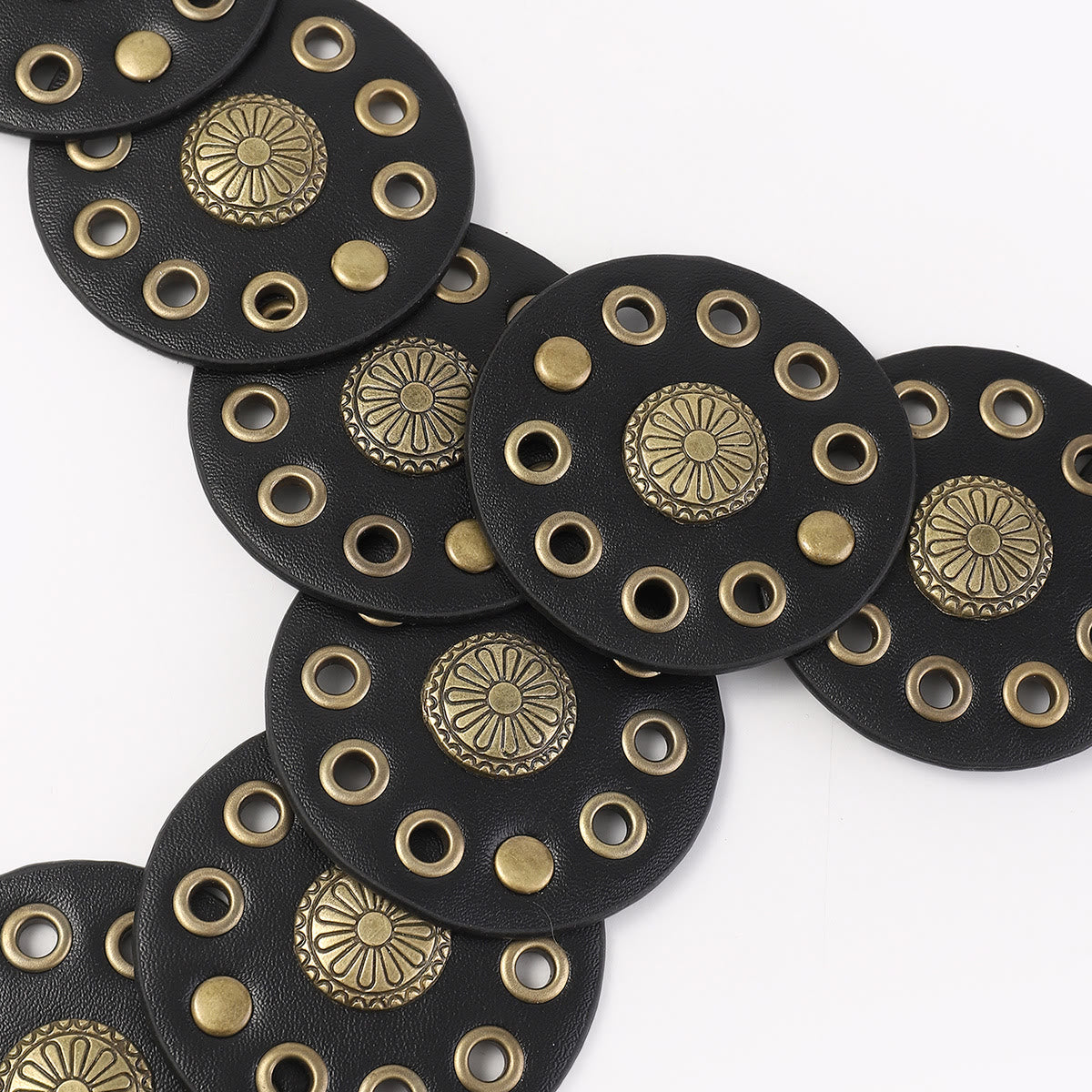 This black belt boldly blends retro charm with modern design. Its iconic circular hollow buckle creates an artistic sense, made of PU leather, durable, comfortable and pleasant. This garment is perfect for enhancing jeans, dresses, or custom pants, adding a vintage style edge to any outfit.
