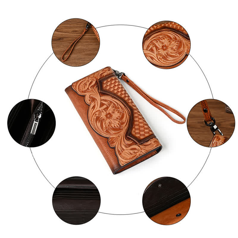 Women's Floral Long Three Folds Leather Wallet With Wrist Strap