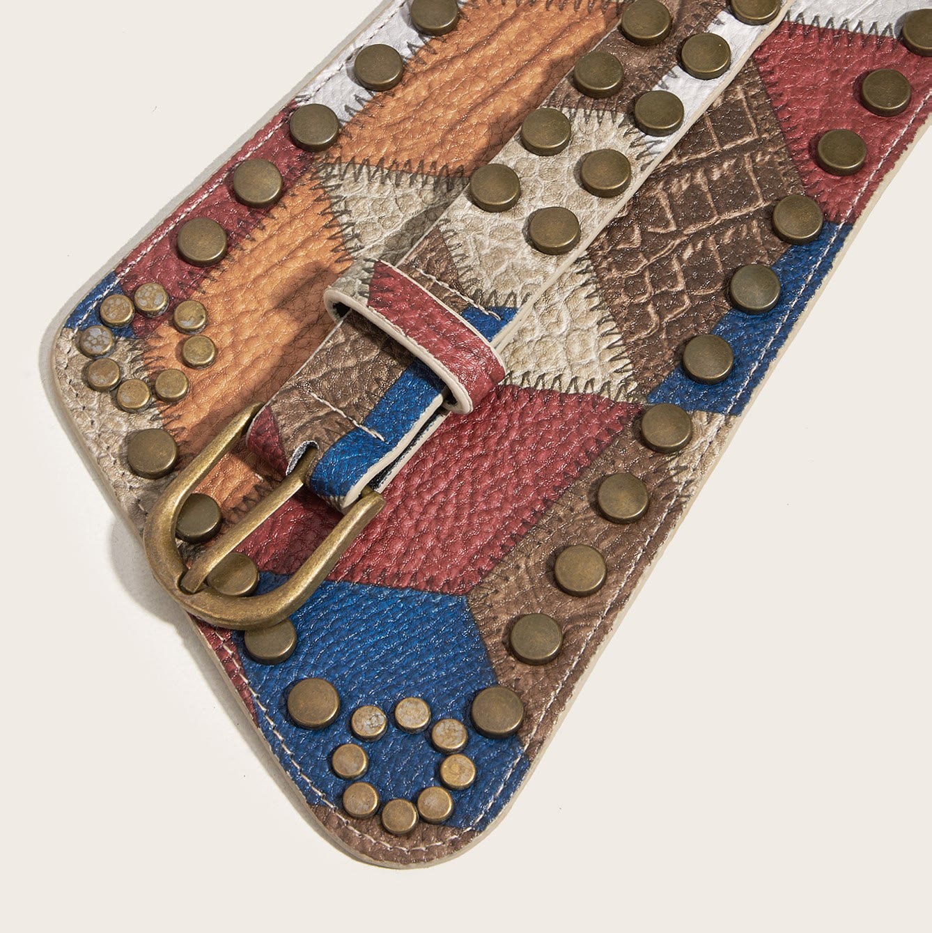 Women's Retro Leather Ball Pattern Antique Copper Nail Waist Belt - Multicolor - image 2