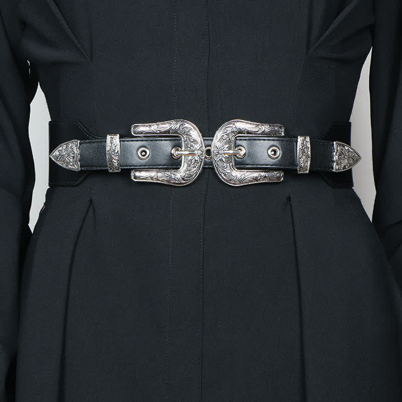 Women's Elastic Double Buckle Leather Belt for Jeans Pants and Dresses