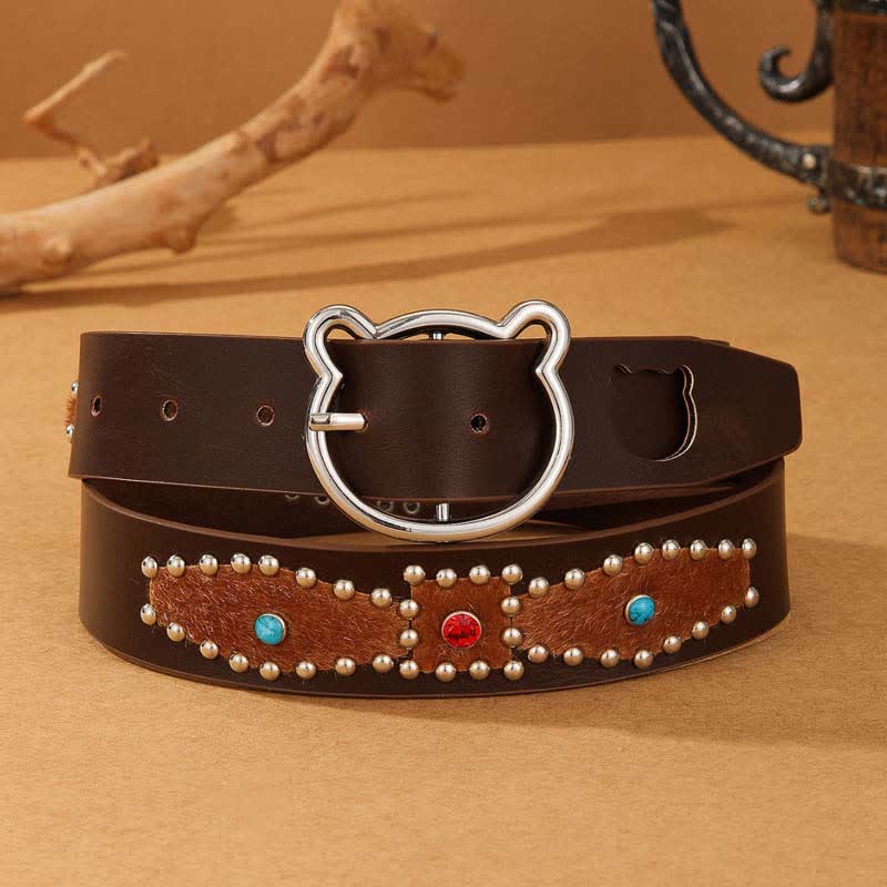 Women's Cute Bear Buckle Patchwork Bohemia Rivets Leather Belt