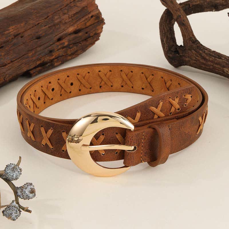 Women's Gold Round Buckle Retro Rope Threading Leather Belt
