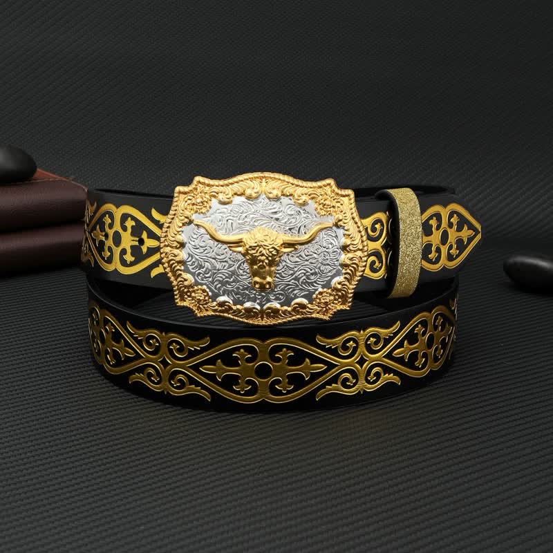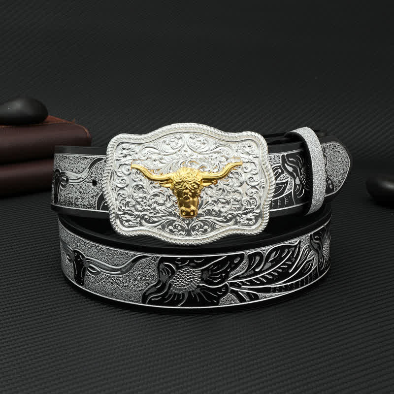 Men's DIY Bull Head Flower Carving Buckle Leather Belt