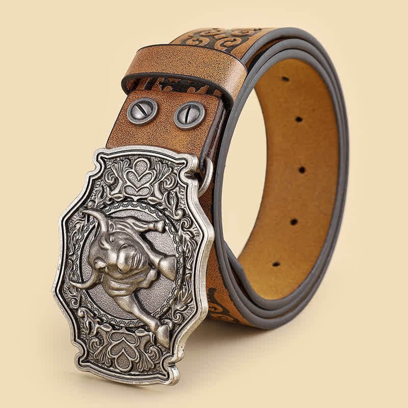 Men's Bronze Bull Pattern Floral Engraved Leather Belt