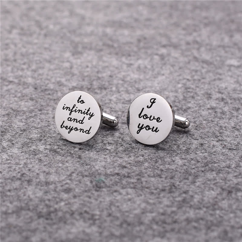 A pair of cufflinks in silver-tone with the words I Love You To Infinity And Beyond! It is easy to match your shirts and tie or other formal, business attire. Initial tie bar and cuff links show your good taste and making you more elegant.