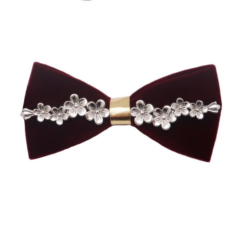 Men's Dark Burgundy Gold Silver Floral Metal Bow Tie