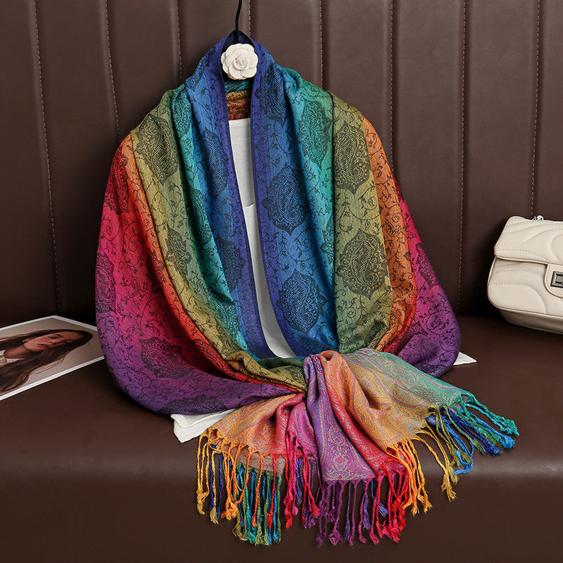 - Inspired by traditional ethnic designs, it features a mesmerizing color gradient that flows like a sunset, adorned with intricate embroidery and finished with playful tassels.