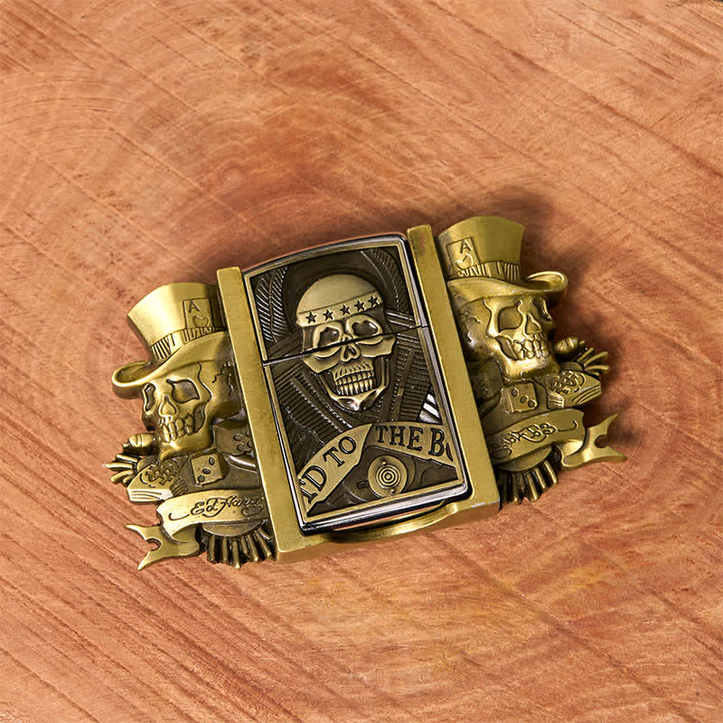 Men's DIY Triple Joker Skulls Bronze Leather Belt with Hidden Lighter