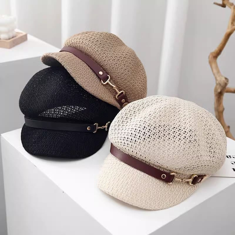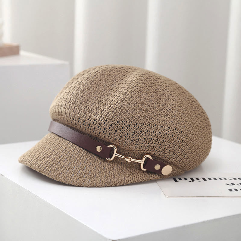 Women's Summer Solid Color Leather Band Decor Straw Beret Hat