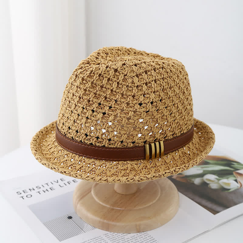 Men's Foldable Leather Strap Hollow Summer Straw Fedora Hat