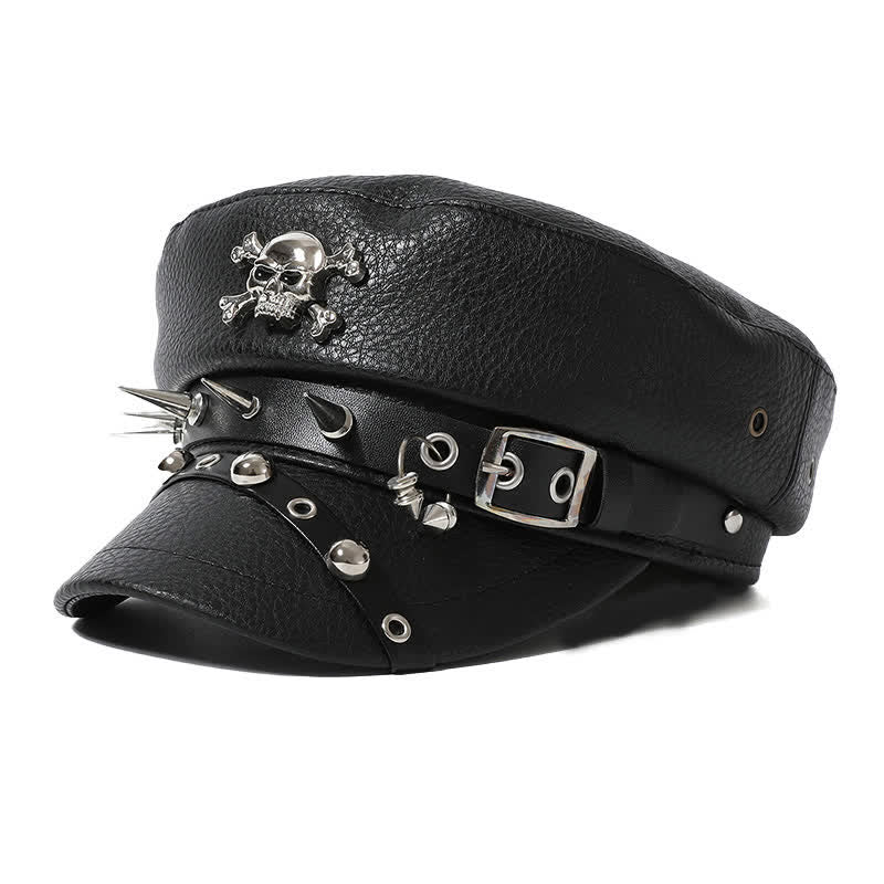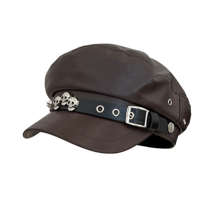 Unisex Dark Style Skull Studded Leather Beret Hat