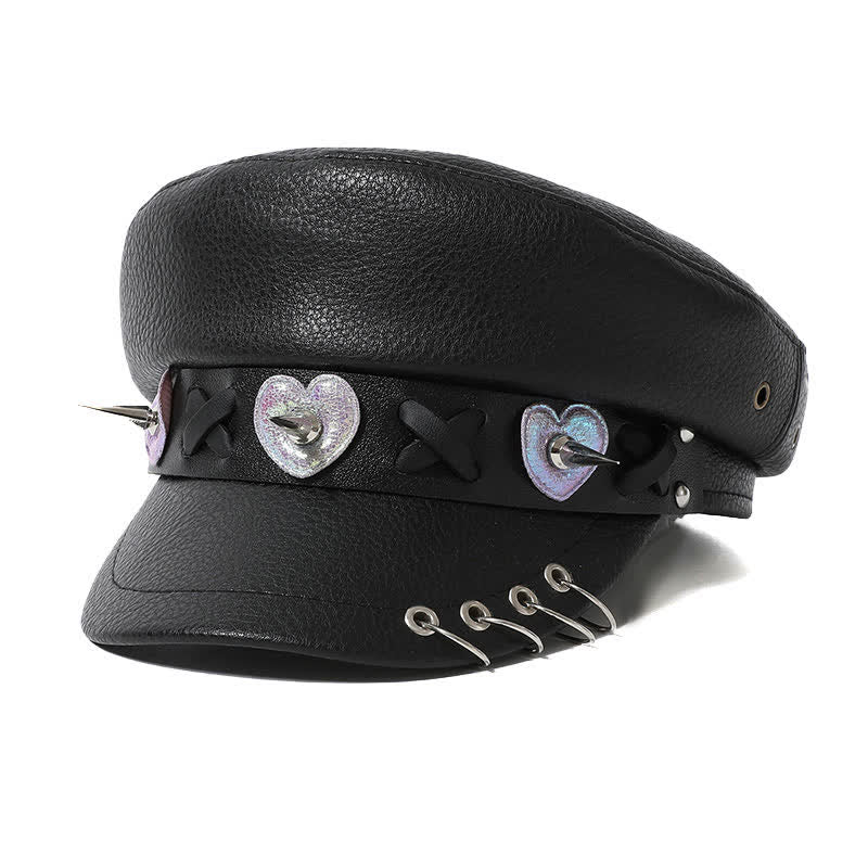 Hip-Hop Style Heart Studded Rivet Black Leather Beret Hat