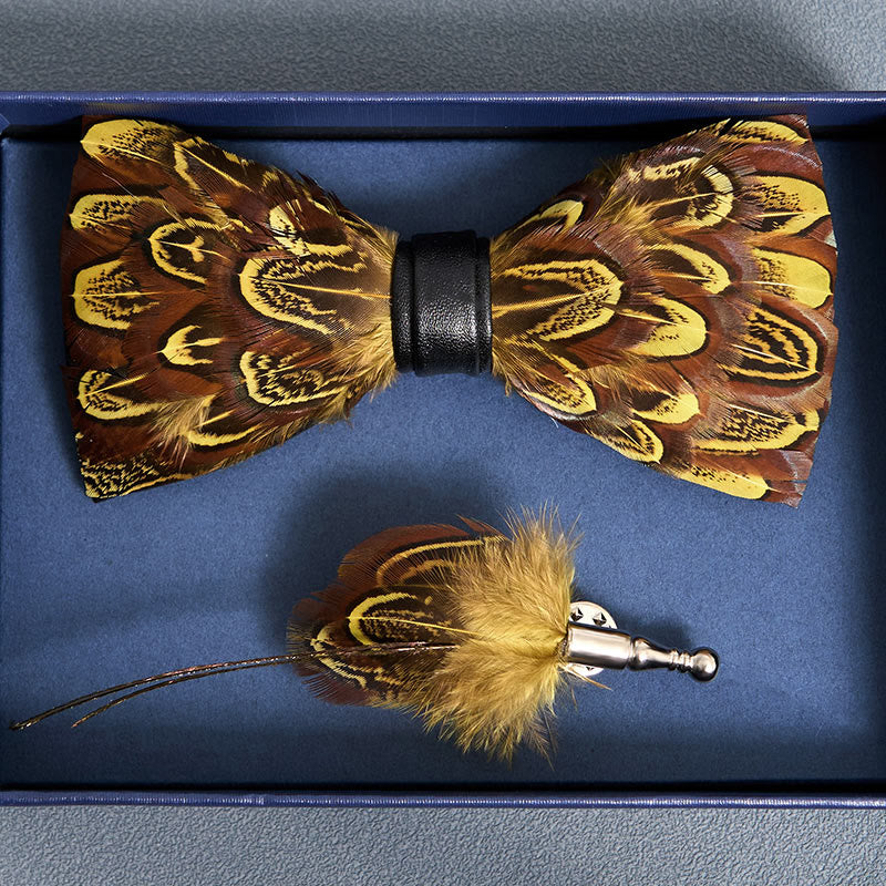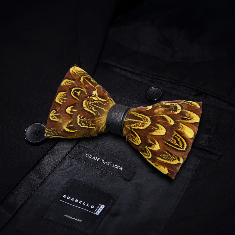 - Features: The pheasant feather bow tie combines varying shades of yellow, almond, and umber with hints of black. Layered with authentic pheasant feathers, this design is dapper with rustic appeal.